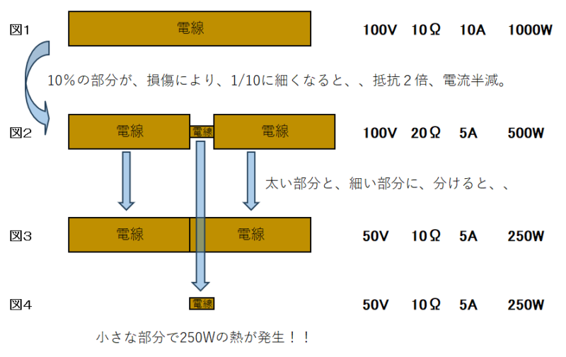 ここで図2の様に、損傷により電線全体の10%の部分が、1/10の断面積になったとします(微小体積のため、電線の太い部分は長さが変わらないとします)。この時電線全体の抵抗は、太い部分が図3に示す通り10Ω、細い部分が図4に示す通り10Ωとなり、全体として20Ωになります(図2の右側)。この時に電線全体に流れる電流は、100V÷20Ω=5Aとなり、電線の僅か10%の部分が1/10に細くなっただけで、流れる電流が10Aから5Aと1/2になることが分かります。ここで図4の通り、細い部分に加わる電圧は、5A×10Ω=50Vで、全体の電圧100Vの半分もの電圧が、細い部分に加わります。これが電圧集中です。細い部分の発生熱量は50V×5A=250Wで、電線全体の10%の部分に250Wもの熱が発生し、ごく狭い部分での発熱により電線が高温になり、場合によっては発火の原因になったりします。